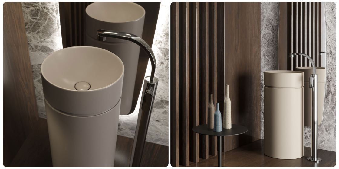 1. Скульптурные доминанты. Коллекция Norma, созданная Эленой Сальмистраро, — это вызов. Отдельностоящая колонна с интегрированной чашей и столешницей — готовый арт-объект. В смелых цветах вроде изумрудного Smeraldo или теплой Terracotta она становится безусловным центром притяжения, задающим тон всему пространству ванной.