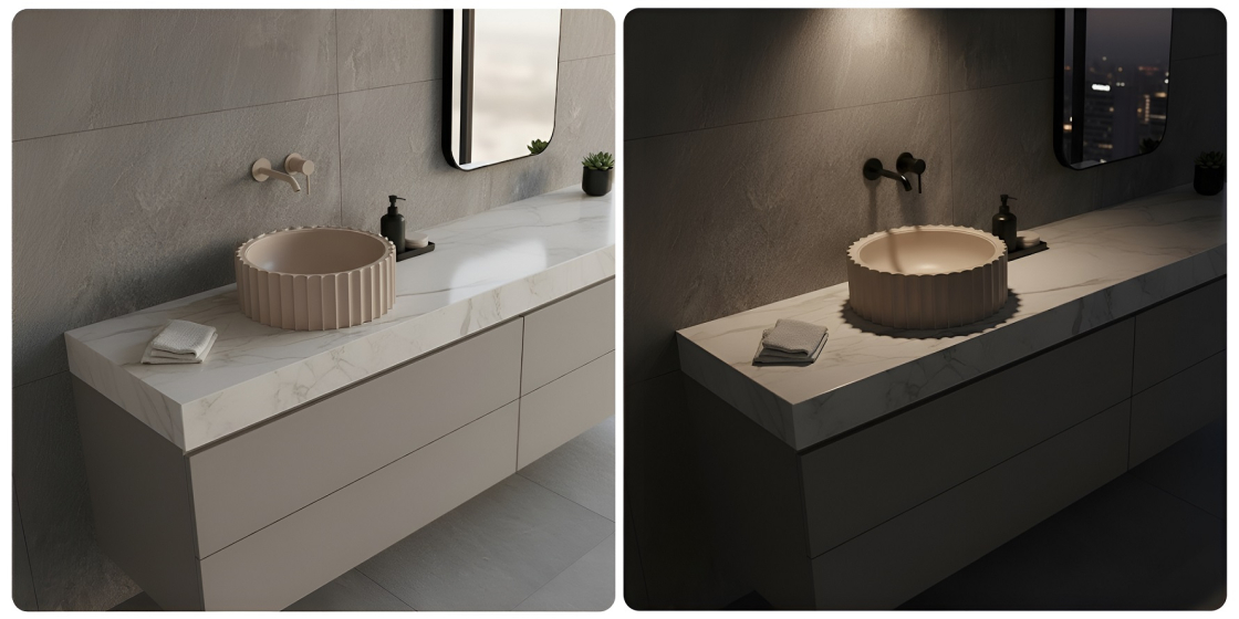 2. Бесшовная интеграция. Полная противоположность — раковины коллекций Una или Twin. Twin того же Паломбы — это цилиндрический постамент, скульптура, подчеркивающая природную красоту материала. Una — это растворение. Эти модели созданы не для того, чтобы их рассматривали, а чтобы их осязали в идеально гладкой, непрерывной поверхности столешницы. Это высший пилотаж дизайна, работающего на ощущение порядка и спокойствия.