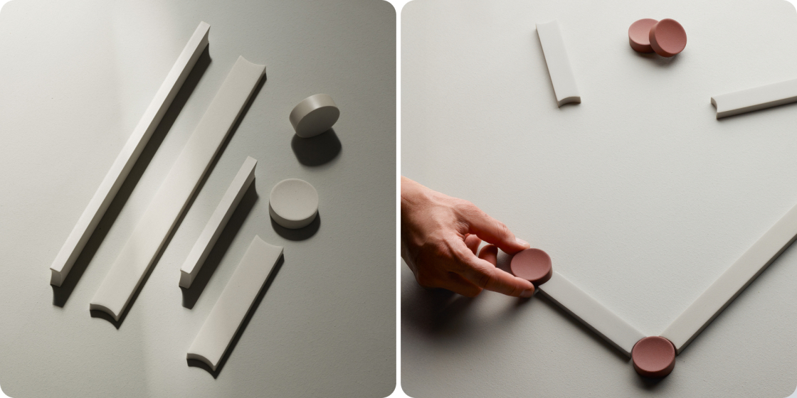 Что же входит в эту симфонию? Коллекция состоит из двух фигурных стержней разной длины (2,6×29 см и 2,6×12,8 см) и круглого элемента-кнопки диаметром 4,2 см. Гениальность системы — в её простоте и безграничных возможностях комбинаций. Вы можете создавать строгие геометрические паттерны или свободные, почти импровизационные композиции, которые будут уникальны для каждого проекта.