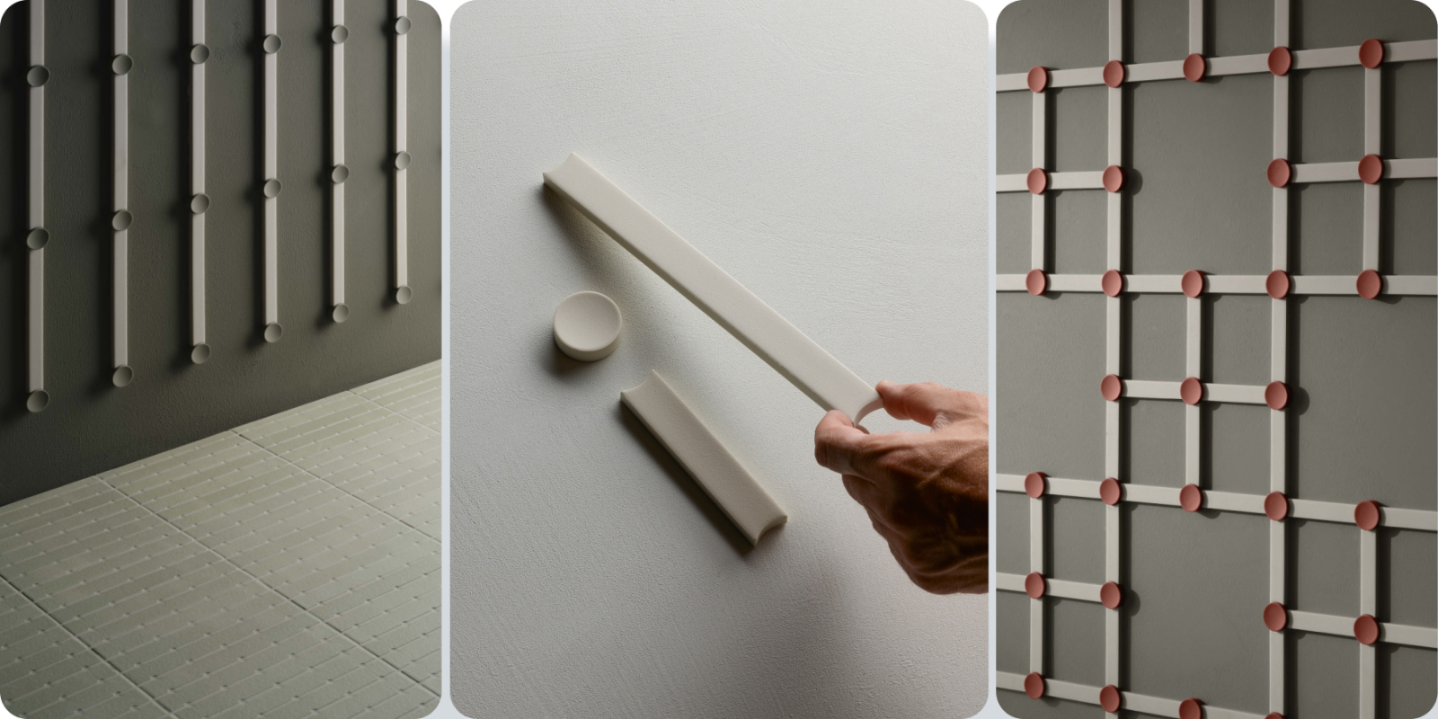 Но истинная магия Aria раскрывается в игре света. Все элементы выполнены из неглазурованного керамогранита (UGL) с использованием цветных глин. Это означает, что цвет — не поверхностное покрытие, а сама суть материала. Он не выцветает, не стирается и обладает тактильной, живой текстурой. Пять приглушенных, сложных оттенков — White, Chalk, Earth, Arctic, Olive — были подобраны так, чтобы гармонировать с любой палитрой. Когда свет падает на такую композицию, он дробится о керамические грани, отбрасывая на стену причудливый узор из теней. Стена оживает, начинает вибрировать, в помещении возникает тот самый «воздух», заложенный в названии.