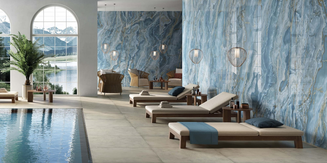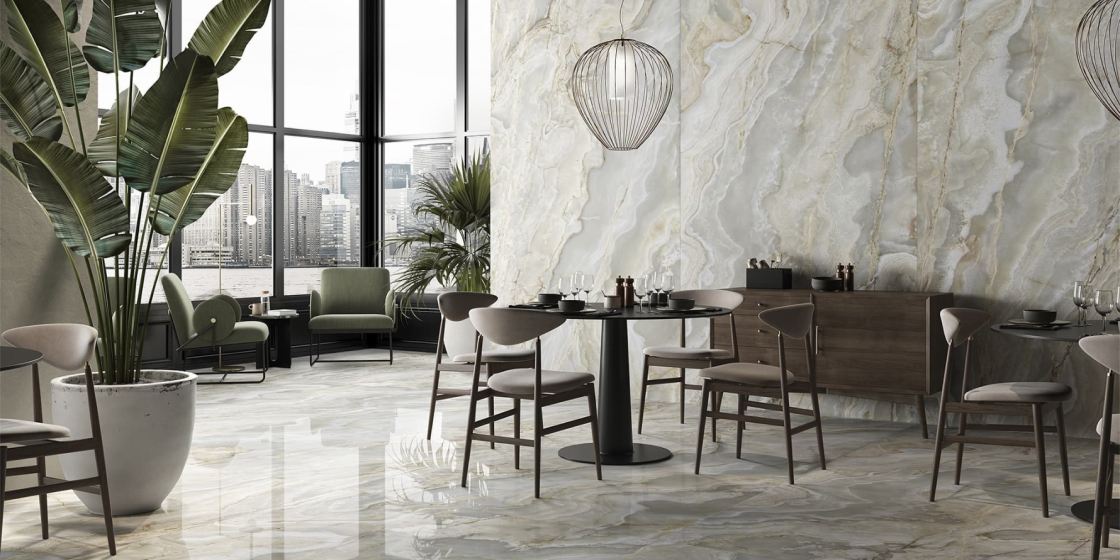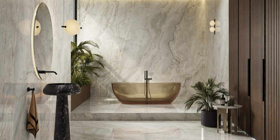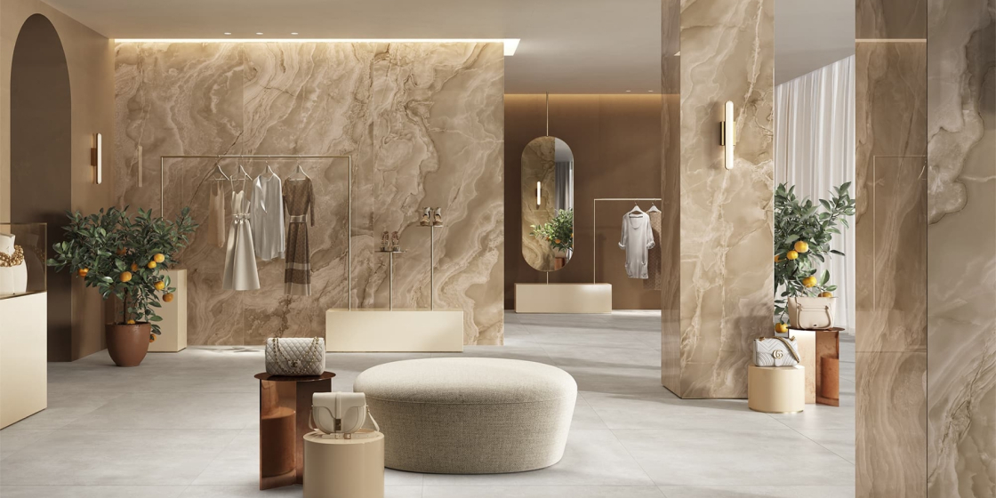 Премиальная коллекция керамогранита, с её благородной палитрой и непревзойдённой эстетикой, создана для тех, кто ищет не просто отделочные материалы, а главный акцент интерьера. Она идеально впишется как в пространство ванной комнаты, так и в спальню ар-деко. Onice Iride станет хорошим решением для гостиной в стиле современной классике, потому что здесь важны чистота линий и глубина материала. В коллекции представлены как стандартные, так и большие форматы плитки, что позволяет создавать бесшовные поверхности, усиливая эффект целостности материала. Пространство становится ещё более воздушным и элегантным.