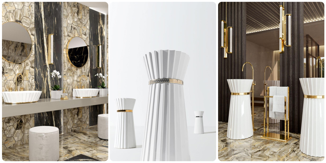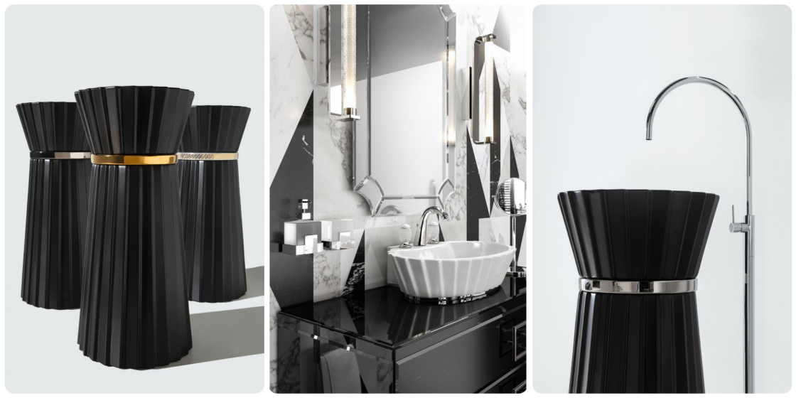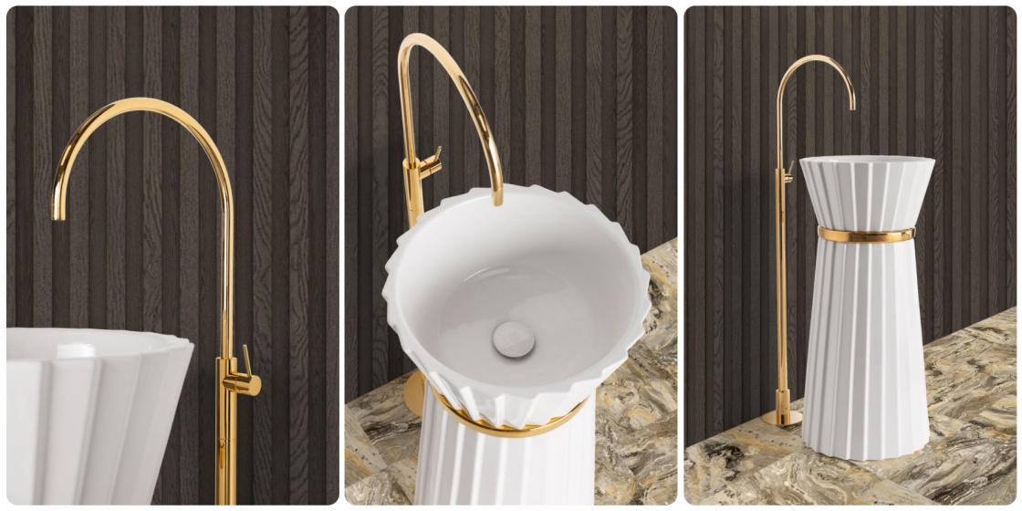 Plissé — не для серых, скучных ванных. Она для тех, кто относится к интерьеру, как к стилю жизни. В минимализме станет главной героиней. Белая глянцевая поверхность и металлические детали добавляют блеска, не перегружая пространство. Античные мотивы в дизайне делают её уместной даже в интерьерах с лепниной и мрамором. В стиле лофт чёрная матовая версия добавит ноту роскоши, не нарушая индустриальный дух. В стиле ар-деко золото раковины-колонны будет перекликаться с позолоченными деталями комнаты, что очень характерно в целом для эстетики 20-х годов прошлого века.