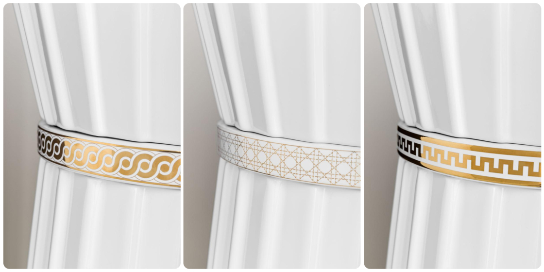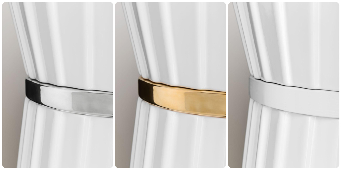 Как и любое произведение модного искусства, Plissé предлагает выбор: белоснежная глянцевая — классика, которая никогда не потеряет своей актуальности. Чёрная матовая — загадочная, как маленькое чёрное платье. Впишется в интерьер, где важны контрасты и глубина. А золотое или хромированное кольцо с орнаментом или без — это финальный штрих, как идеально подобранные аксессуары.