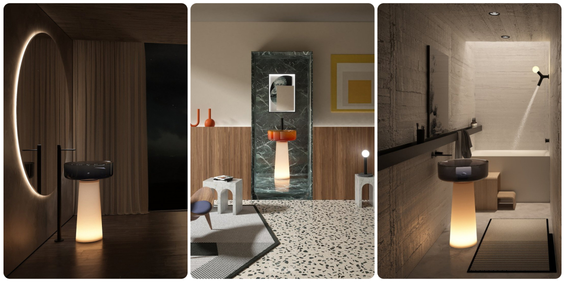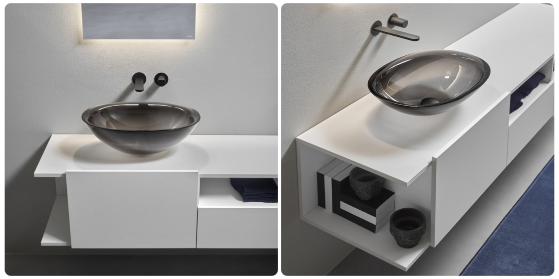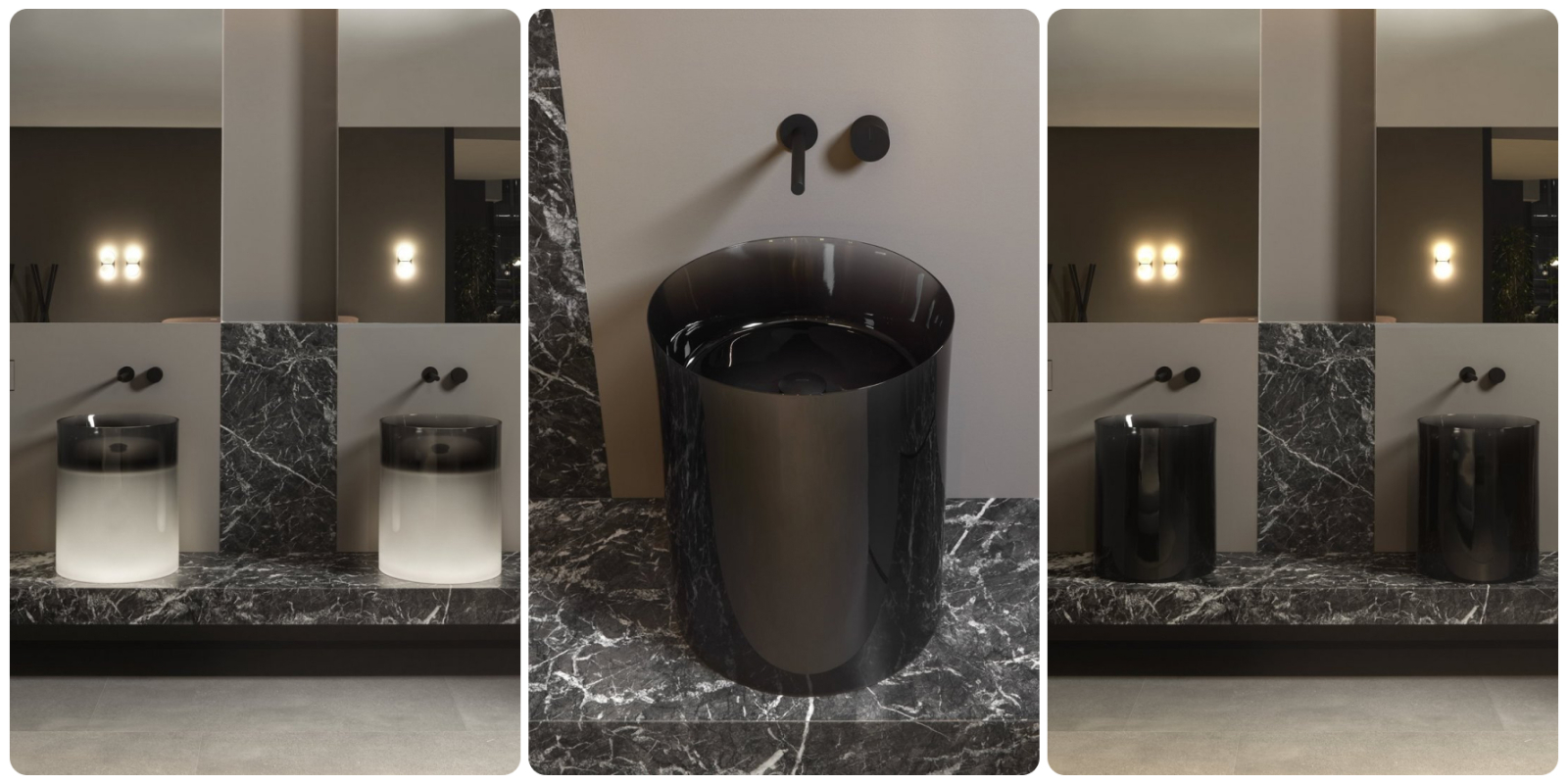 Коллекция предлагает богатый выбор комбинаций: чаша может быть выполнена из Cristalmood, мрамора, лакированного Flumood или других материалов и оттенков. Это открывает почти безграничные возможности для кастомизации и гармоничного сочетания с другими элементами интерьера.