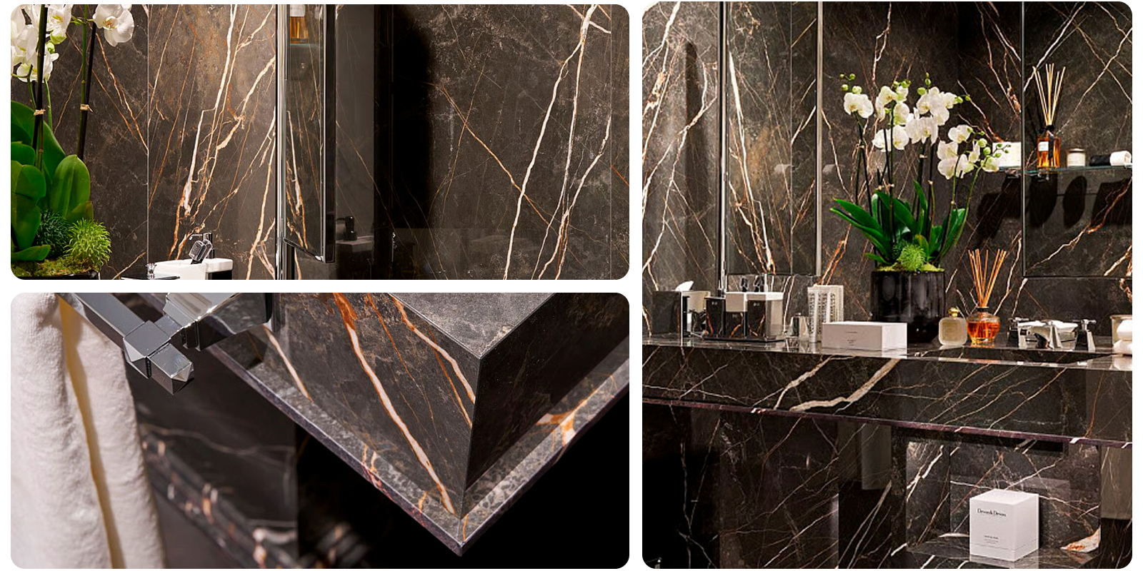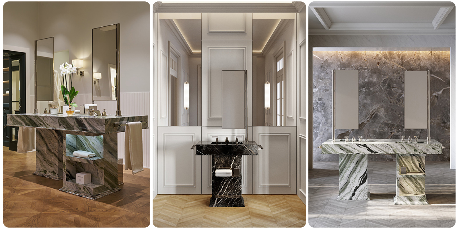 Коллекция My Love Water Table Vanity выделяется многообразием размеров и уникальными характеристиками. Модель Small (L: 104,6 см, H: 89/199 см, D: 60,0 см) включает одну раковину и четыре полки. Medium и Master (L: 191 см, H: 89/199 см) — это двойные туалетные столики: Medium имеет глубину 60,0 см, а Master, предназначенный для центральной установки, — 90,0 см. Оба предлагают две раковины и восемь полок. Ключевая особенность — использование керамогранита с эффектом мрамора (Port Laurent, River Jade, Taj Mahal), изготовленного по инновационной технологии ALL-OVER, обеспечивающей визуальную непрерывность рисунка. Функциональные элементы включают полотенцедержатели и поворотные на 90° зеркала, что делает эти изделия максимально удобными. Каждое изделие Devon&Devon уникально, поскольку рисунок прожилок керамогранита варьируется, имитируя натуральный камень.