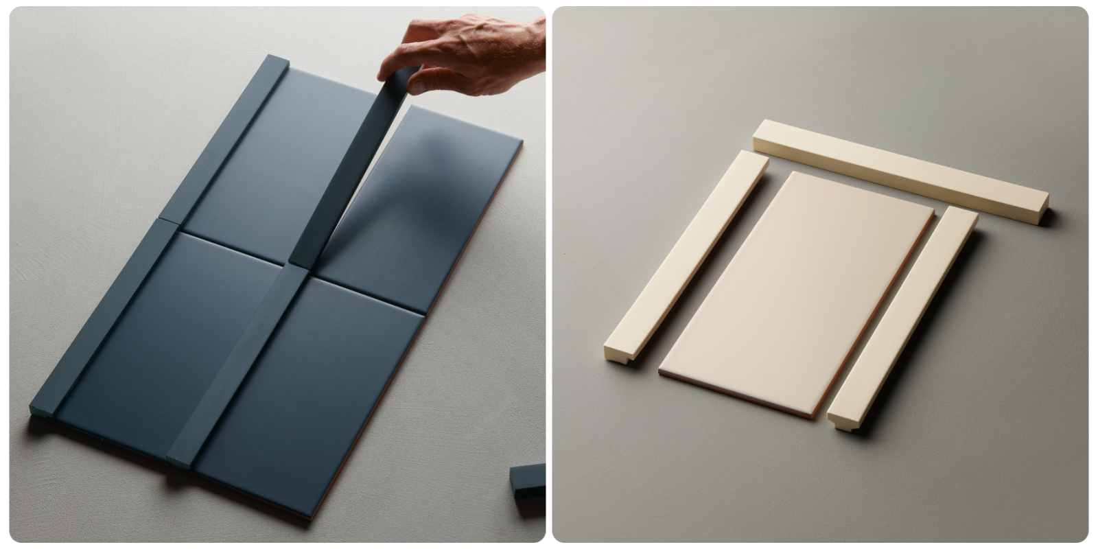 Motivo сочетает глазурованные элементы размером 14×28 см с матовой отделкой с неглазурованными стержнями из фарфоровой керамики (UGL) размером 2,8×28 см в формах «T», «L» и «Terminale». Каждая деталь доступна в шести матовых цветах: белый, меловой, известняковый, земляной, арктический и графитовый, а также в одном металлическом серебристом варианте. Это сочетание линейных геометрических элементов с матовой плиткой создает игру теней и рельефов, которые придают стене особый характер.