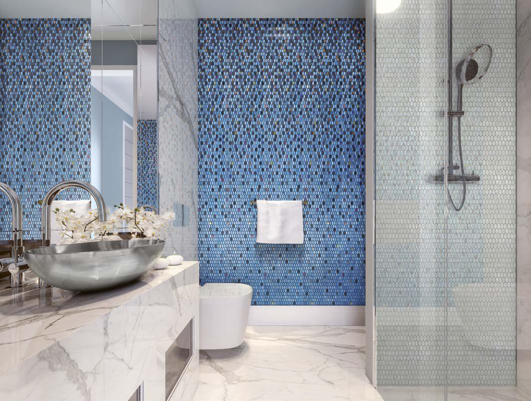 Коллекция Crystal Degrade от Sicis представляет собой мозаику из смальтового стекла, где ромбовидные чипсы со слегка закругленными краями образуют пиксельный градиент, плавно переходящий от одного оттенка к другому. Гладкая полированная поверхность подчеркивает игру света и создает неповторимую текстуру. Модули размером 30,4 x 264,8 см, состоящие из девяти квадратных панелей, позволяют создавать элегантные композиции, подходящие для ванных комнат, кухонь, офисов и других помещений. Мозаика Crystal Degrade, благодаря своей влагостойкости, идеально подходит для бассейнов и ванных комнат.