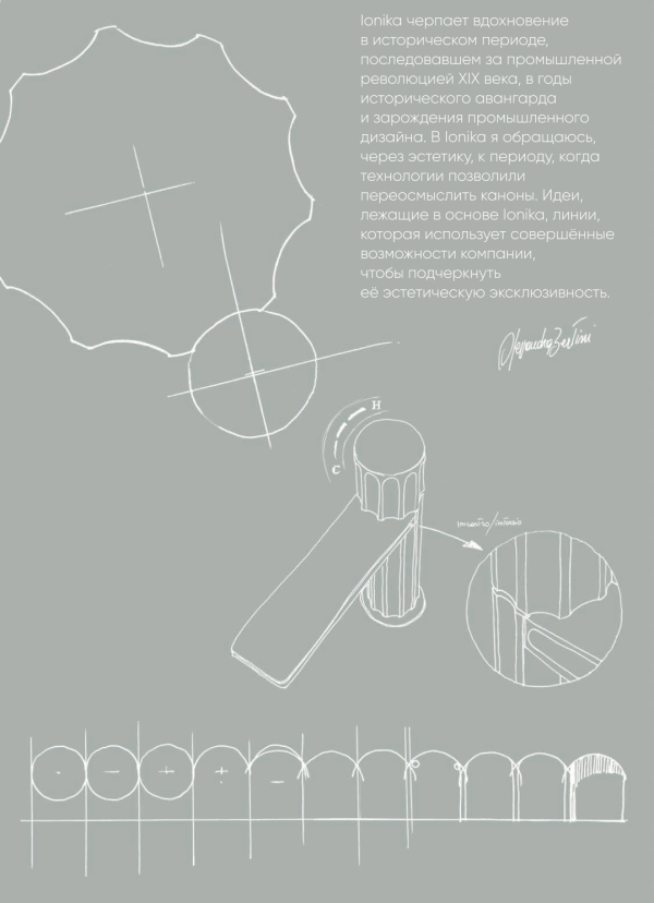 Коллекция Ionika вдохновлена греко-классической архитектурой и её символом — ионической колонной. Она также отсылает к эпохе после промышленной революции XIX века — времени Исторических авангардов и зарождения индустриального дизайна.
