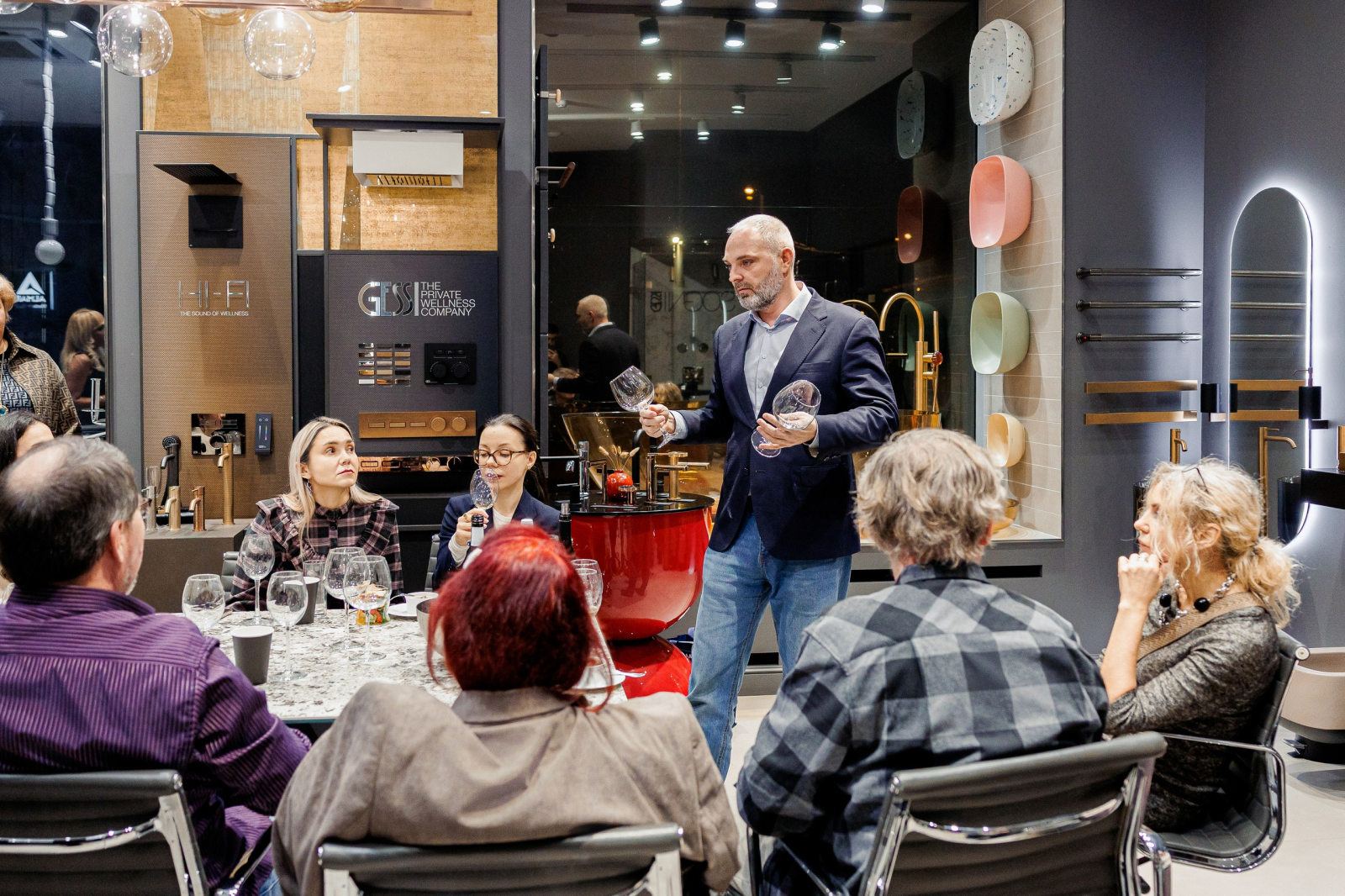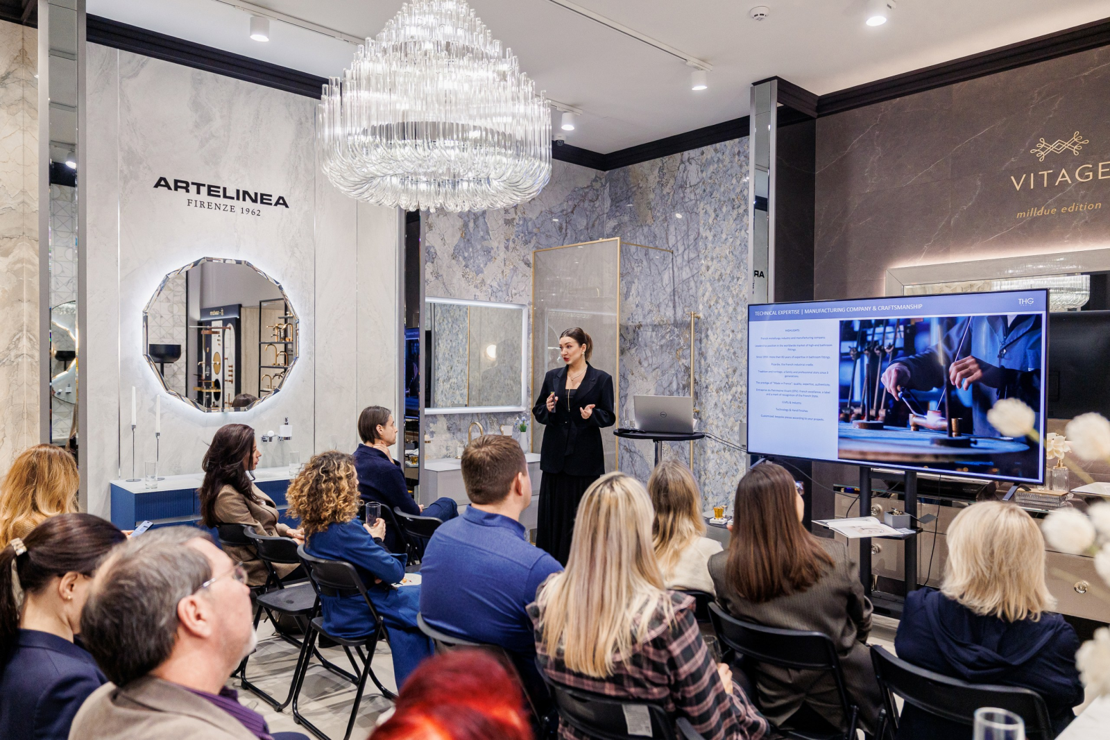 Гостей погрузили в историю бренда, особенности производства и философию сотрудничества с Baccarat, где цветной французский хрусталь соединён с ювелирной металлообработкой THG Paris.