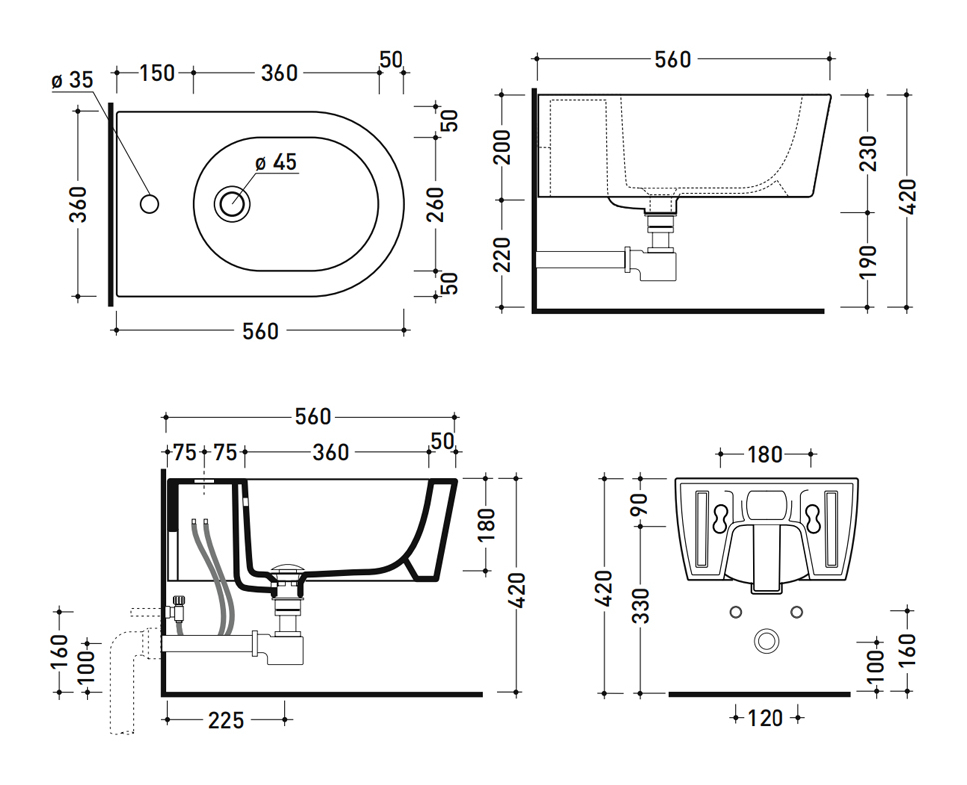 Биде Flaminia Link в подвесном формате создаёт ощущение лёгкости и делает уборку более удобной. Размеры 560x360 мм при высоте 230 мм обеспечивают комфортное использование, сохраняя при этом компактность конструкции.