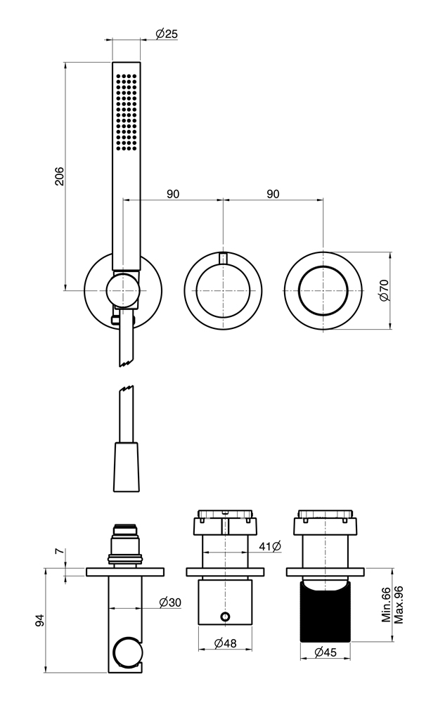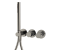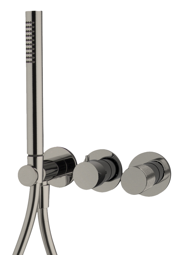 Комплект внешней части включает ручной душ с насадками, предотвращающими образование известкового налета и держателем, дивертор для переключения потоков и гибкий шланг Chromalux длиной 1500 мм. Конструкция рассчитана на два потребителя и обеспечивает надёжное подключение. Скрытая часть приобретается дополнительно.