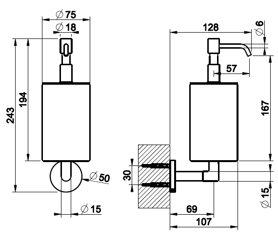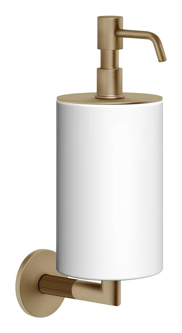 Настенный дозатор для жидкого мыла Gessi Ingranaggio отсылает к эстетике индустриального дизайна. Его массивная цилиндрическая форма с характерным зубчатым ободом повторяет визуальный код коллекции, вдохновлённой механизмами и инженерной точностью.