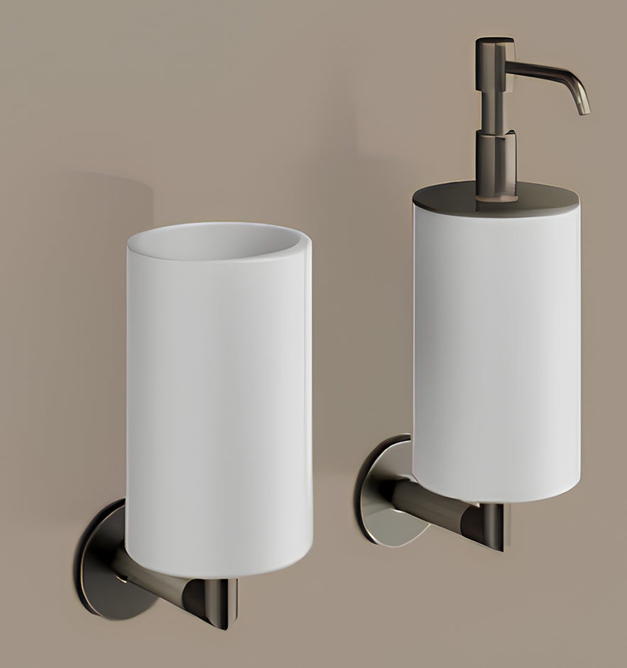 Корпус с геометрически точными линиями и надёжным настенным креплением обеспечивает удобство использования и визуальную чистоту поверхности. Белая вставка мягко выделяется на фоне латунной отделки, создавая выразительный, но сбалансированный акцент.