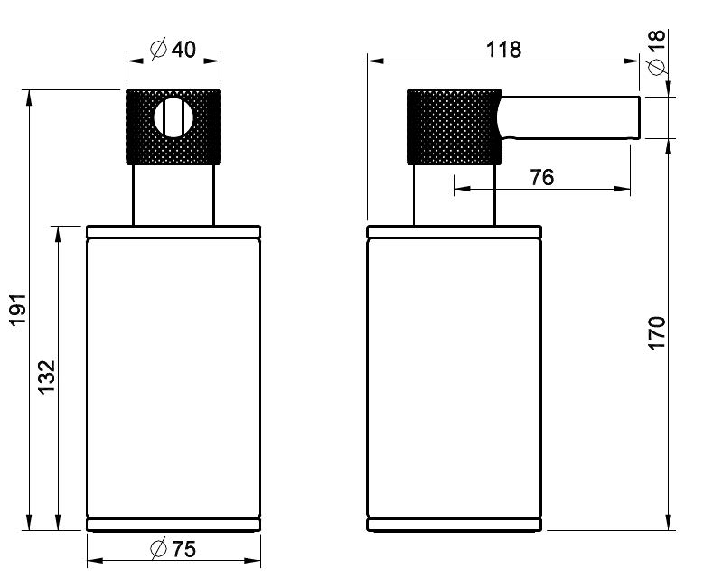 Дозатор Gessi Inciso в настольном исполнении объединяет лаконичную форму и выразительное сочетание оттенков. Диаметр корпуса составляет 75 мм, высота — 191 мм, что обеспечивает удобное использование и визуальную сбалансированность на раковине или столешнице.