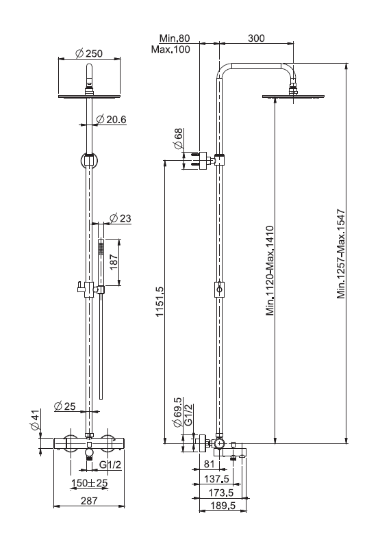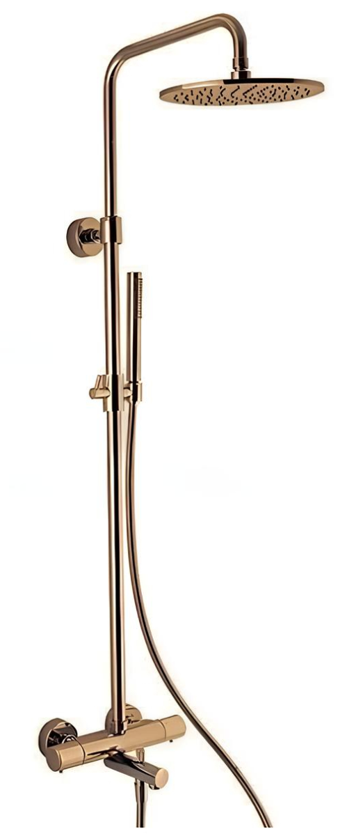 Душевая система Carlo Frattini Wellness в цвете брашированная бронза объединяет внешнюю термостатическую часть, стойку высотой 1547 мм и верхний душ диаметром 250 мм. Конструкция укомплектована ручной лейкой и шлангом, что делает модель удобной для ежедневного использования. Душевая система подчёркивает сбалансированность функциональности и визуальной выразительности, сохраняя общий стиль пространства.