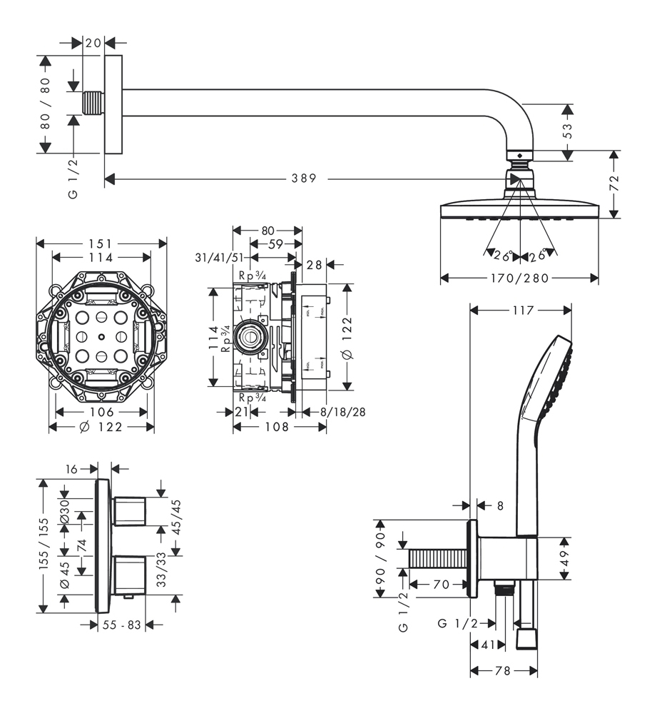 В комплект Hansgrohe Croma E входит верхний душ размером 280x170 мм, который обеспечит приятный и расслабляющий поток воды, аналогичный дождю. Это создает ощущение спа-процедуры прямо у вас дома. Кроме того, ручной душ и шланг длиной 1250 мм позволяют легко управлять давлением и направлением потока воды, что делает использование душа комфортным и практичным. Пользователи могут выбирать между различными режимами работы, подстраивая каждую деталь под свои предпочтения.