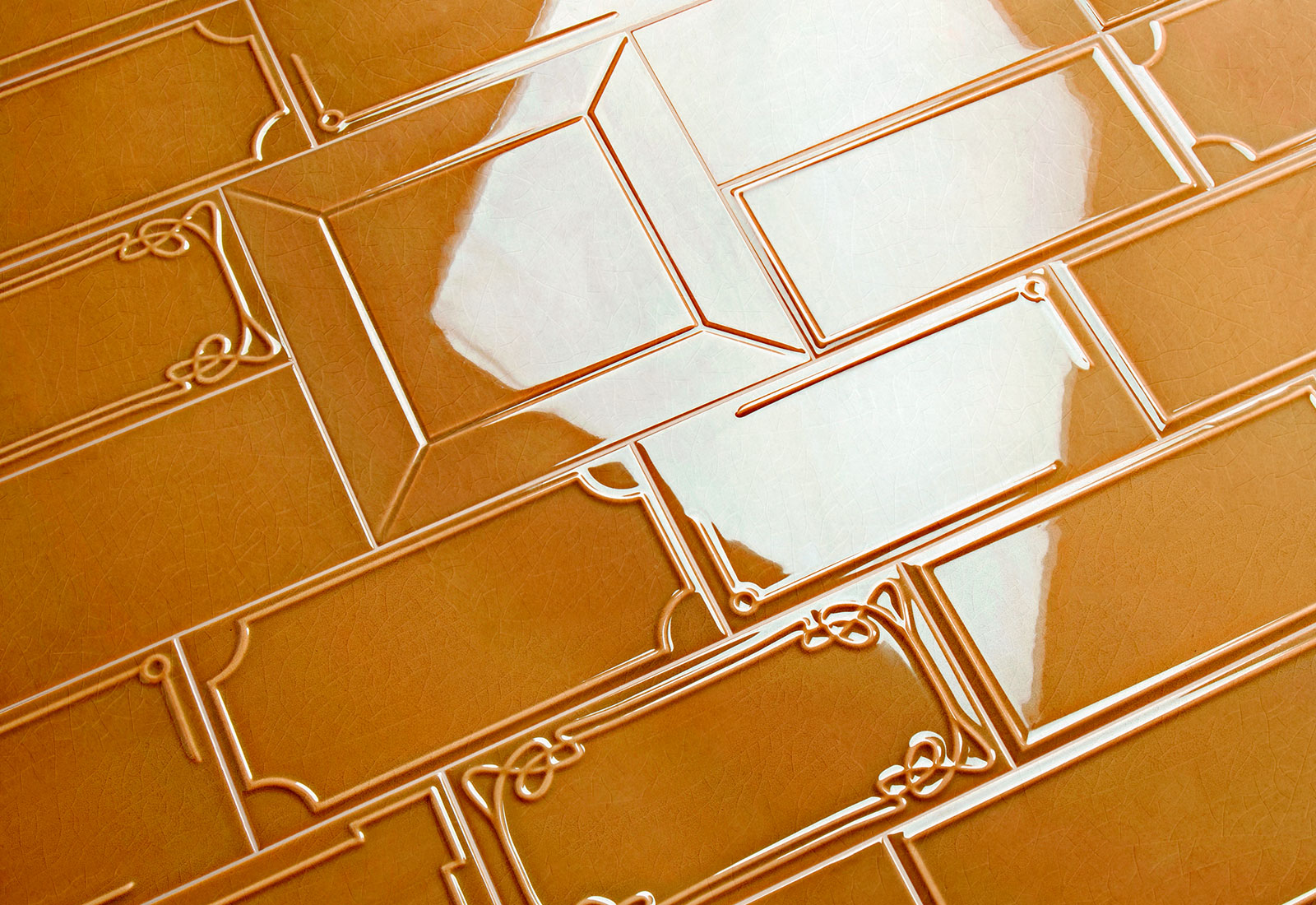 Глянцевая поверхность с двойным обжигом и щедрым нанесением глазури дарит яркость и глубину цвета, подчёркивая красоту карамельного оттенка и оригинальный рисунок кракелюра. Такой подход обеспечивает долговечность покрытия и устойчивость к внешним воздействиям. Формат с фигурной рамкой добавляет интерьеру структурности и характерной декоративности, что делает плитку гармоничным элементом стиля арт-деко, классика, прованс и ретро.