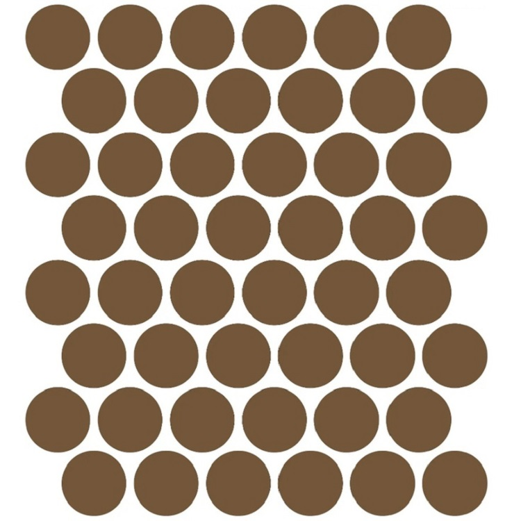 Керамогранит в форме небольших кругов размером 5х5 см, закрепленных на однотонной сетке размером 33х37 см, облегчает укладку и расширяет дизайнерские возможности. Матовая поверхность плитки обладает приятной текстурой. Этот материал отличается высокой прочностью, морозостойкостью и устойчивостью к износу, что позволяет использовать его как в жилых, так и в коммерческих интерьерах. Оттенок создаёт в помещении атмосферу спокойствия и утончённости, гармонично сочетаясь с различными стилевыми решениями.