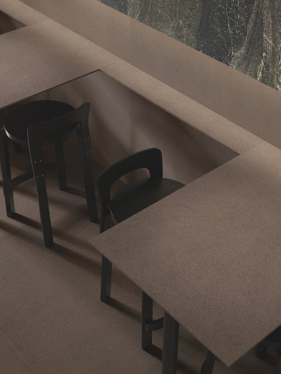 Поверхность керамогранита оживает благодаря отделке Top Lapped: бархатистая матовость подчеркивает богатство тона, а естественные минеральные вкрапления формируют живую текстуру. Керамогранит FMG TerraPura в цвете Marrone в этом оттенке идеален для создания уютных интерьеров, акцентных зон и комплексных решений. Он придает пространству атмосферу стабильности и естественной гармонии.