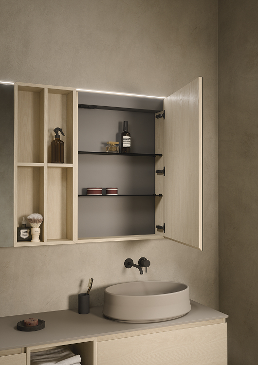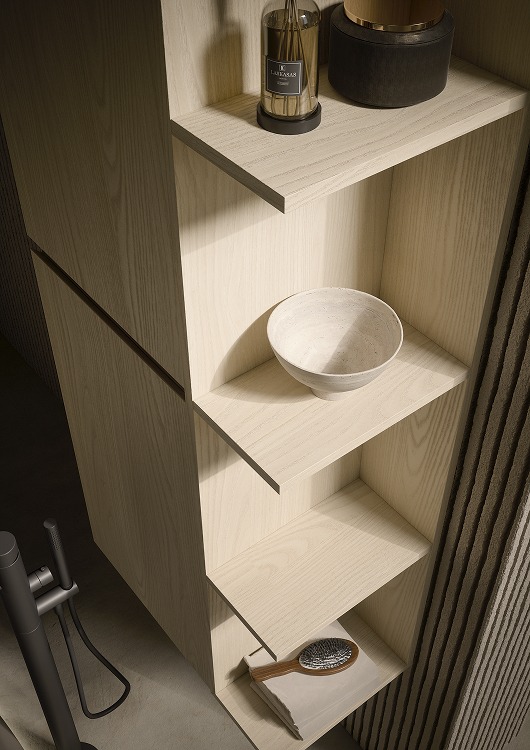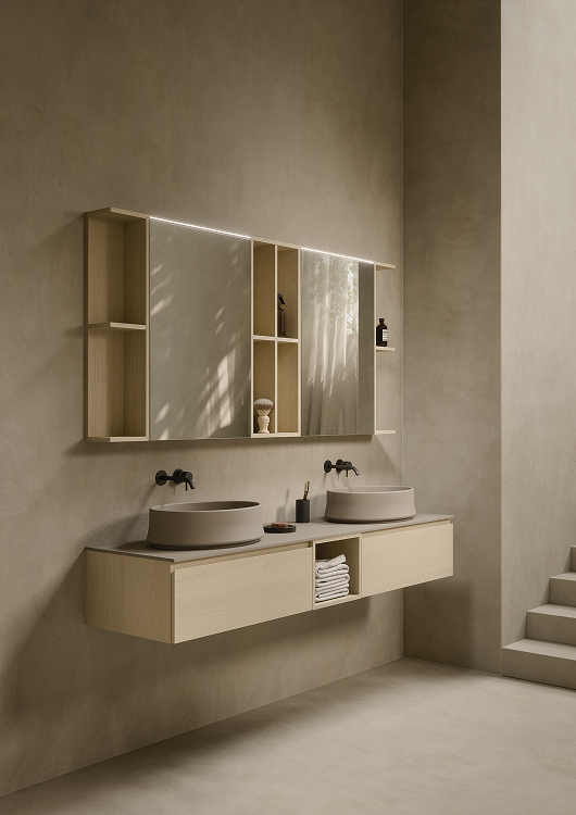 Тумба выполнена в отделке меламин "Light Oak" (Светлый Дуб), придающем интерьеру естественную теплоту. Столешница из инновационного Purefeel "Tortora Elegance" с накладной раковиной Lightfeel Volcano создает единый, гармоничный ансамбль. Зеркало Gleam и открытые полки в тон "Light Oak" завершают образ, добавляя функциональности.
