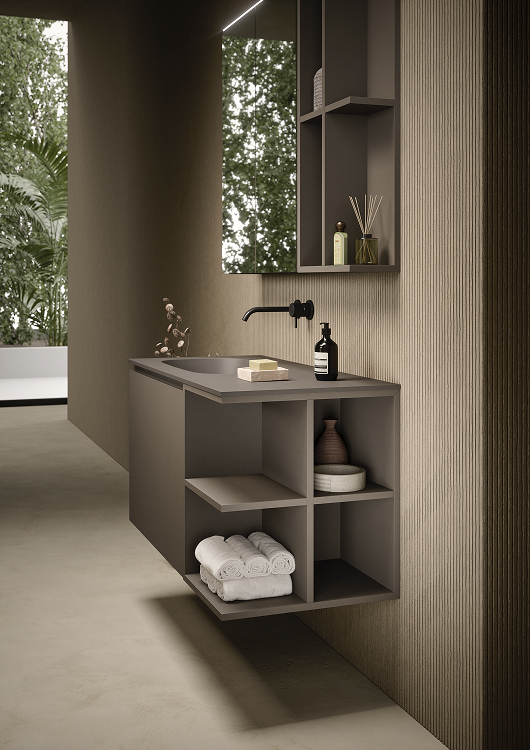 Тумба выполнена в изысканной матовой лакированной отделке "Caffè Elegance" (Элегантный Кофе), которая придает интерьеру глубину и благородство. Столешница из инновационного материала Purefeel "Caffè Elegance" с интегрированной раковиной Grace образует монолитный, безупречный ансамбль. Зеркало Gleam, выполненное в той же матовой лакировке, завершает образ, создавая цельное и стильное решение.