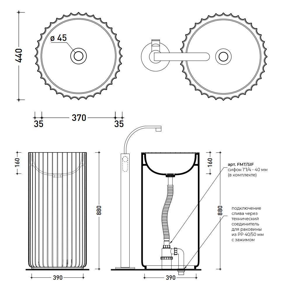 В конструкции отсутствует перелив, что сохраняет чистоту формы и подчёркивает лаконичность силуэта. В комплекте предусмотрены крепления и сифон FMT/SIF, благодаря чему монтаж проходит быстрее и удобнее. Поверхность керамики имеет глянцевую отделку, устойчива к влаге и проста в уходе.