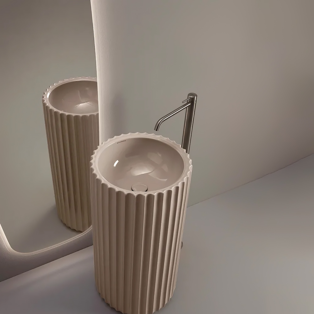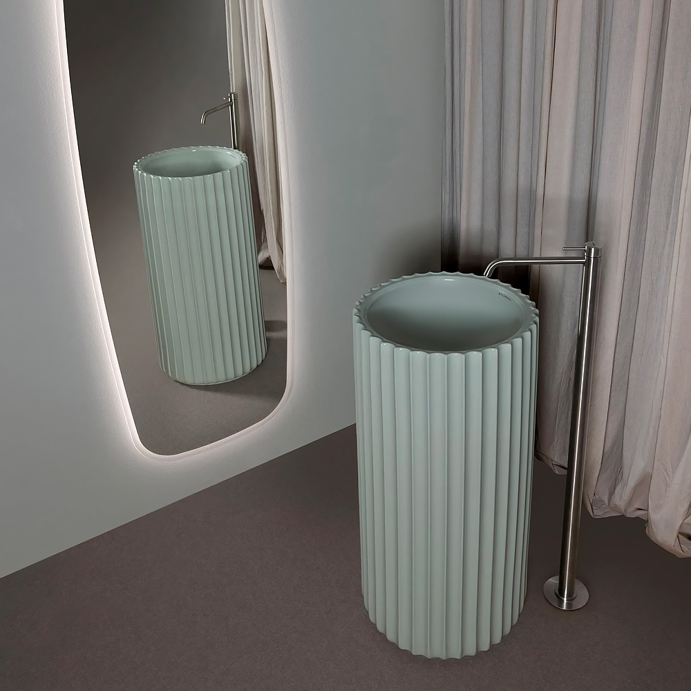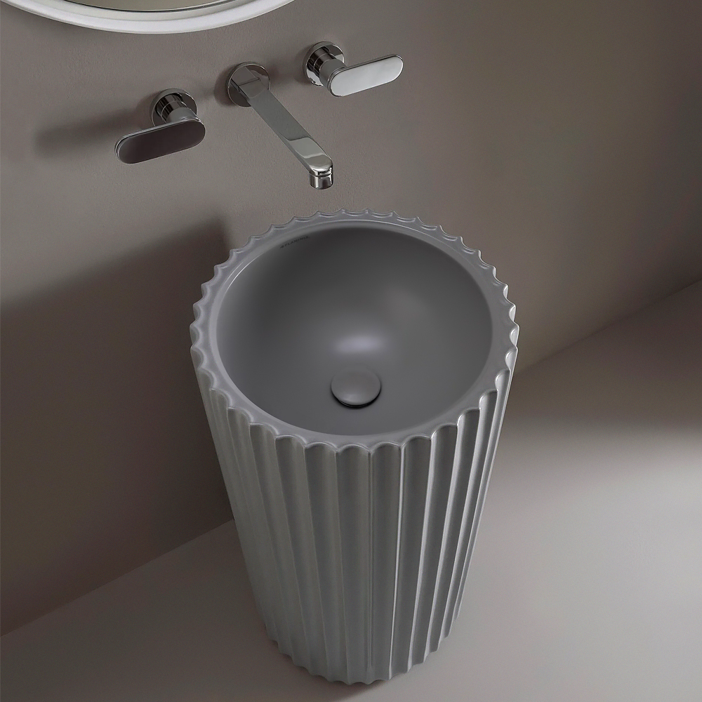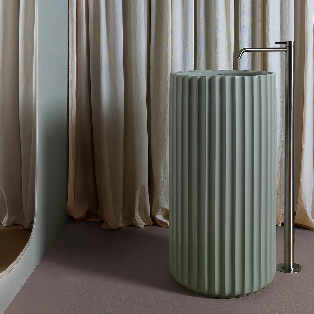 Раковина Flaminia Monosettecento отдельно стоящая с диаметром 440 мм и высотой 850 мм создаёт яркий акцент в пространстве. Колонный формат установки со сливом в пол делает изделие цельным и монументальным, а гладкие линии выделяют его современный характер.