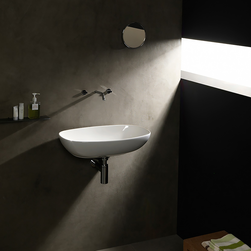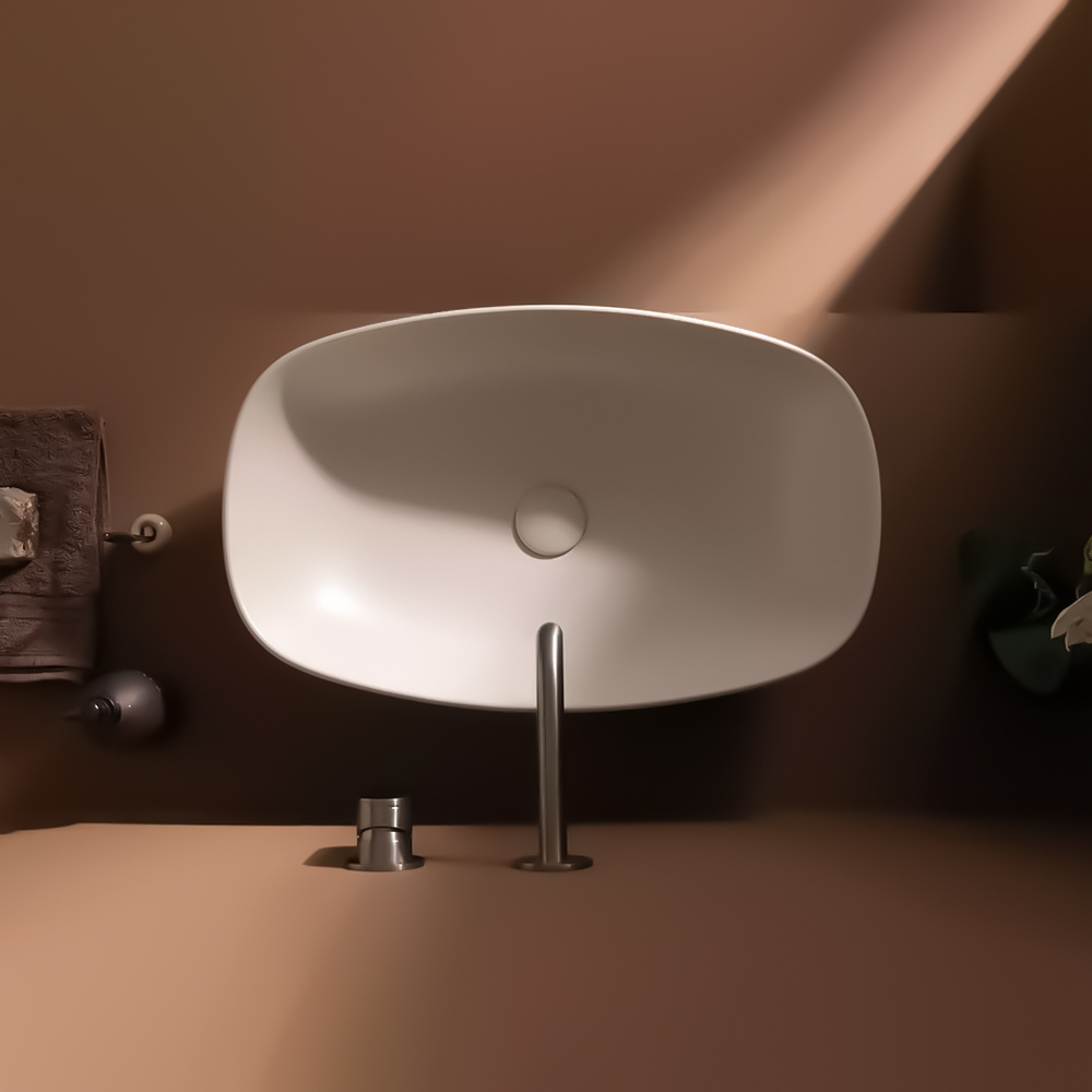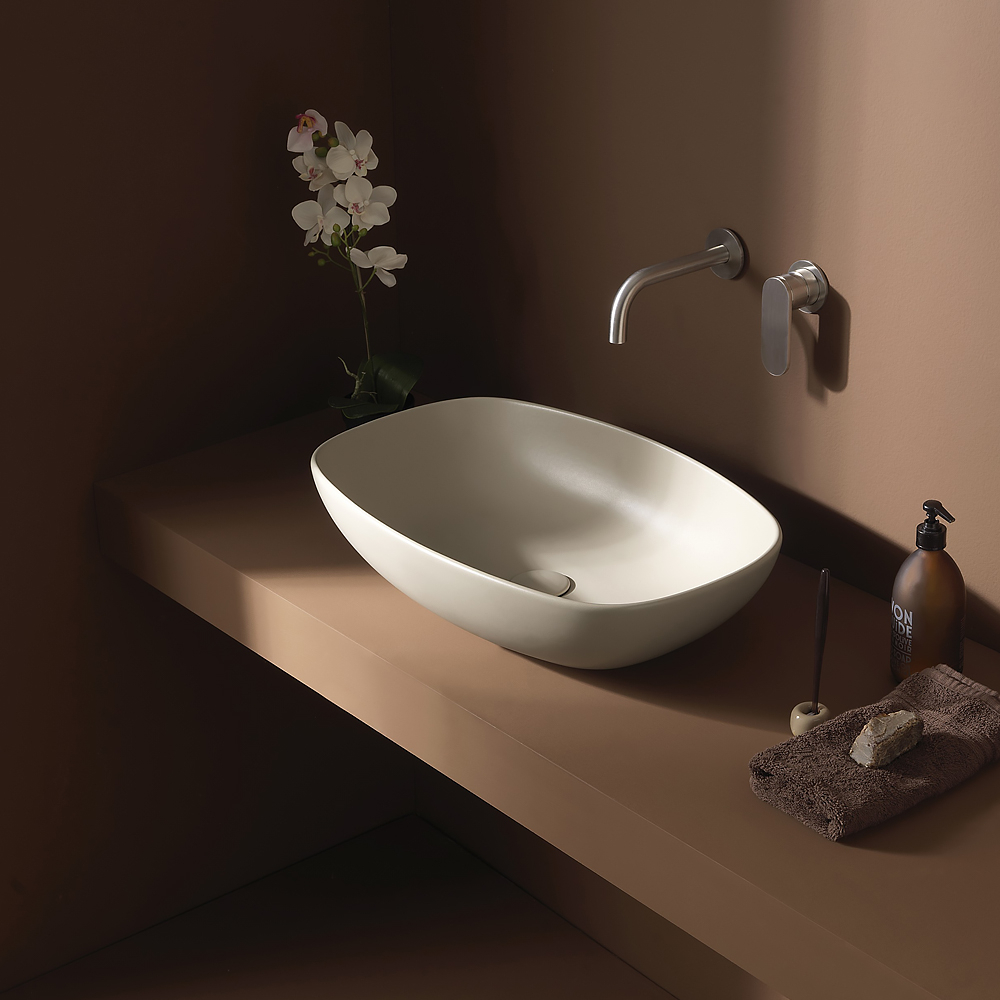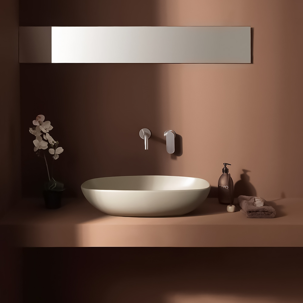 Раковина Flaminia Nuda Slim размером 600x390 мм и высотой 140 мм предназначена для установки на столешницу или тумбу. Её тонкие стенки и аккуратные пропорции создают лёгкий и современный силуэт. Отсутствие отверстия под смеситель позволяет использовать настенный или отдельно стоящий вариант, что открывает больше свободы для выбора комплектации.