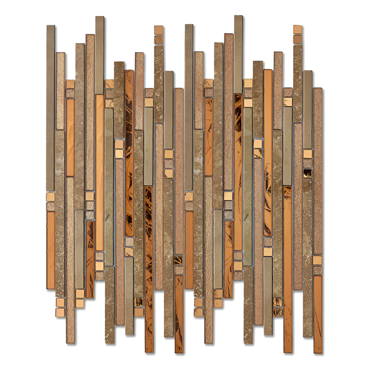 Модель Fibers Thin Wood — изысканное оформление интерьера стеклянной мозаикой и мраморной крошкой. Природные тона Vis Two Colibrì, Kaki Colibrì сочетаются с мрамором Noce и Amarelo Marlena, составляя привлекательную композицию глубиной 4 мм. Шаг в 10 мм усиливает ощущение объема, превращая декоративный элемент в подобие воздушного стекляруса. Листы мозаики собраны на прочной сетке и имеют стандартный размер 286 х 325 мм. Подходят для интерьеров любого назначения, включая жилые зоны и общественные учреждения.