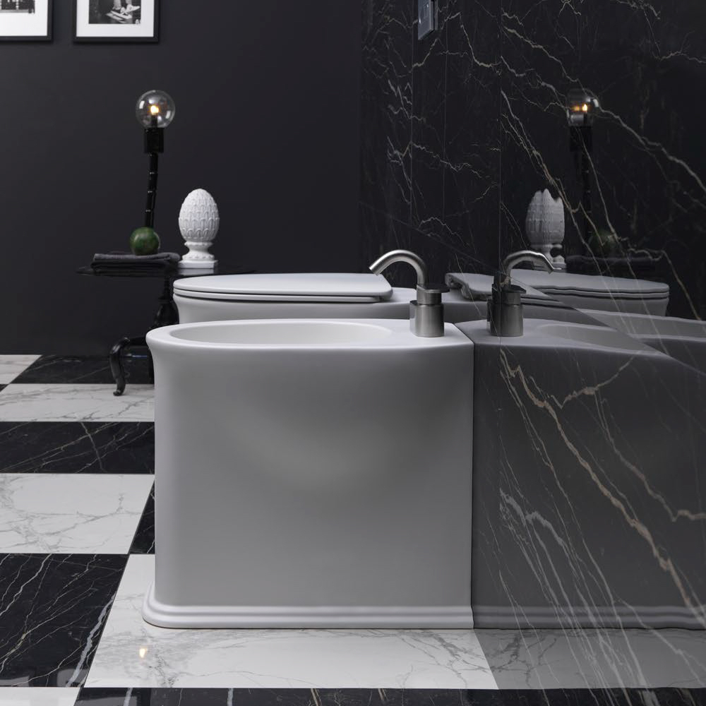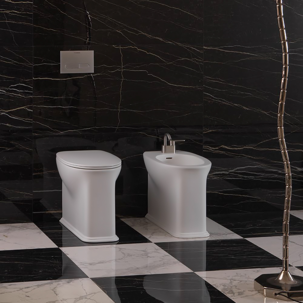Сиденье для унитаза Flaminia Madre Slim отличается утончённым силуэтом. При размерах 475x360 мм его высота составляет всего 36 мм. Такой тонкий профиль подчёркивает современный характер коллекции и делает комплект визуально легче.
