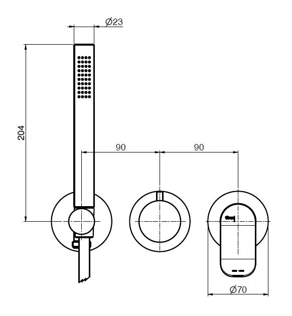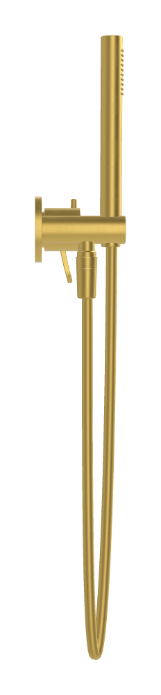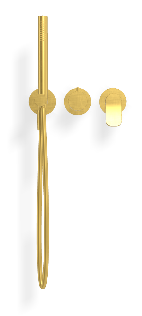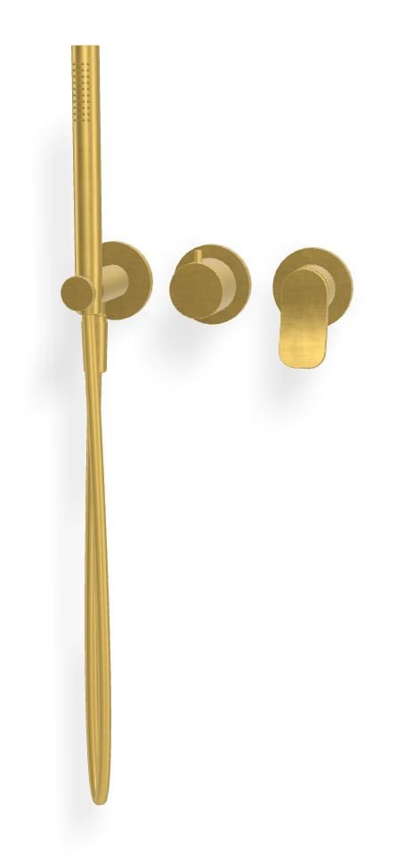 Внешняя часть компактно вписывается в стену, сохранена аккуратная геометрия, а шланг хромалюкс длиной 1500 мм обеспечивает комфортный диапазон движения. Ручная лейка удобна для ежедневного ухода, точечного применения и ополаскивания после принятия ванны или душа. Брашированное золото особенно выигрышно смотрится в сочетании с керамикой тёплых оттенков, натуральным камнем, деревянными консолями и прозрачными перегородками.