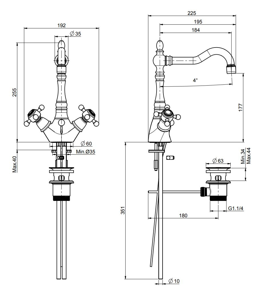 Конструкция оснащена вращающимся изливом, удобным донным клапаном 1”1/4 и двумя гибкими шлангами для надежного подключения. Двухвентильное управление сохраняет традиционный облик смесителя и обеспечивает практичное использование, а также долговечность всех элементов.