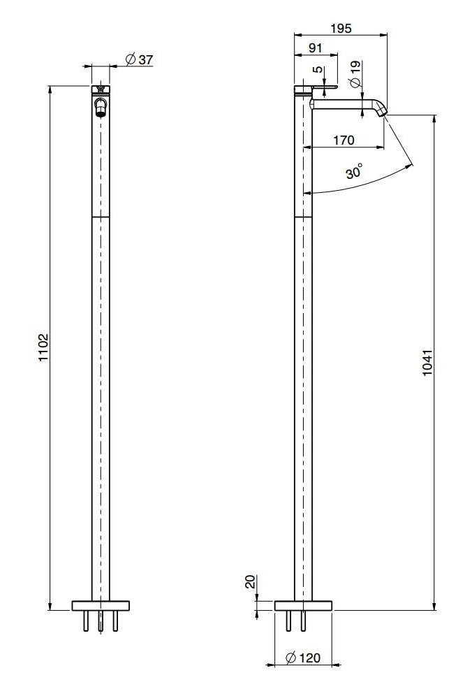 В конструкции предусмотрен встроенный аэратор, обеспечивающий мягкий и направленный поток воды при минимальном расходе. Внешняя часть смесителя выполнена из латуни с долговечным покрытием, устойчивым к ежедневному использованию. Монтаж напольного типа предполагает скрытую установку подводки, что сохраняет чистоту и минимализм дизайна.