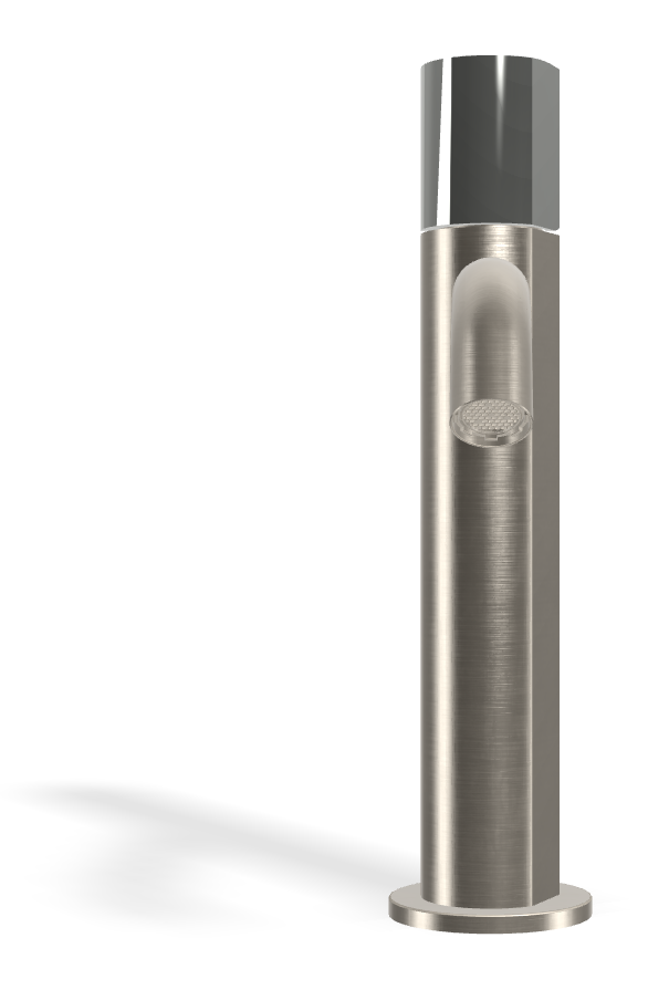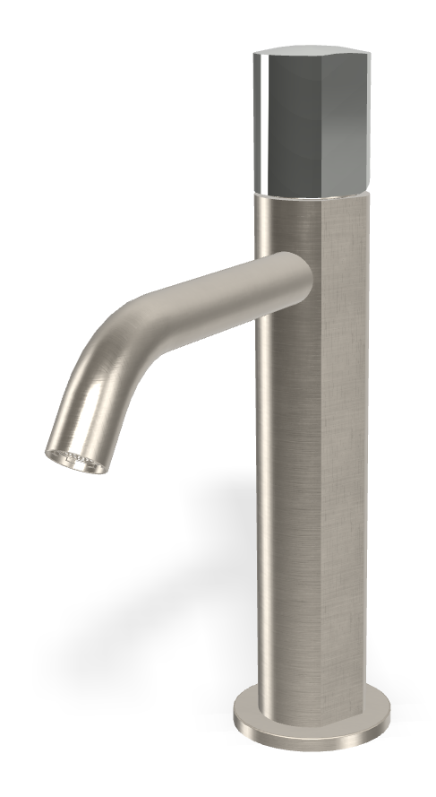Отделка в брашированном никеле создаёт спокойную матовую поверхность с мягким металлическим оттенком. Такой цвет легко сочетается с натуральным камнем, светлой керамикой, микробетоном и тёплыми древесными фактурами. Корпус выглядит строго и собранно, пропорции выверены, подача воды ровная и контролируемая, что подчёркивает инженерный характер.
