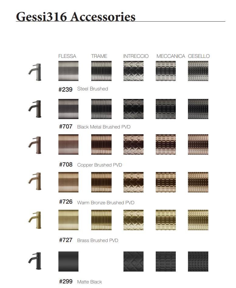 Цвет Matte Black подчёркивает графичность силуэта смесителя для раковины Gessi 316 и легко комбинируется с природными текстурами камня, древесины и микробетона. Матовая поверхность приятна на ощупь и практична в уходе, а продуманная гидравлика обеспечивает стабильный напор и плавность регулировки, что важно для ежедневного комфорта и экономного расхода воды.