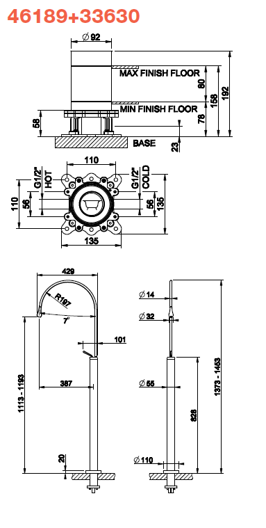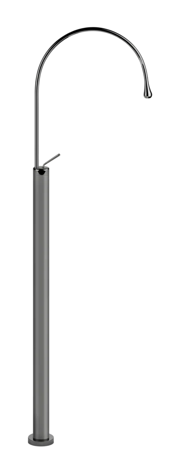 Напольная конструкция модели подчеркивает её выразительный силуэт и привносит в интерьер динамику. Высота 1453 мм делает изделие удобным для установки рядом со свободно стоящей раковиной. Излив длиной 387 мм поворачивается, что увеличивает практичность при повседневном использовании.