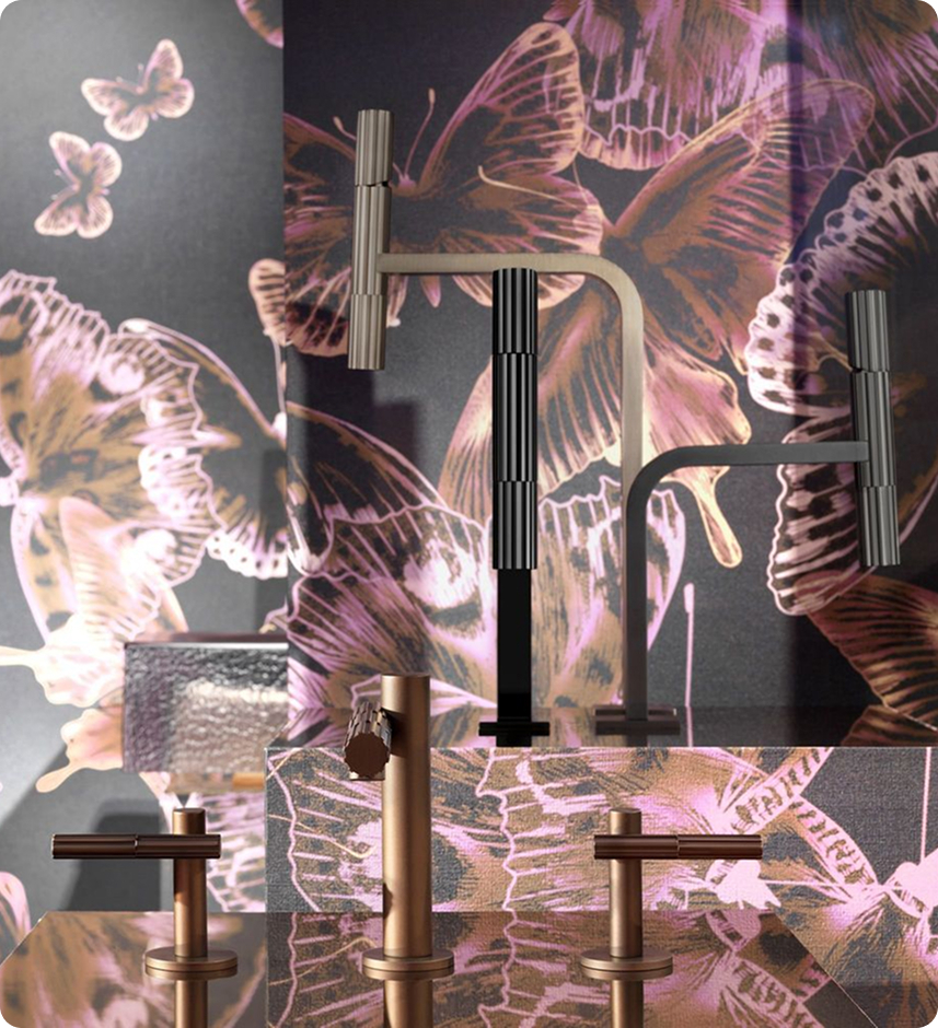 Дизайн Incastri черпает вдохновение в традиционном японском деревянном конструкторе чидори (система соединения элементов без гвоздей). Отсюда происходит идеальная, графическая чистота формы. Смеситель имеет монолитный, угловатый излив, который элегантно контрастирует с цилиндрическим ребристым элементом управления. Эта ребристая фактура не только придает изделию тактильности, но и является ключевой эстетической деталью, подчеркивающей слияние итальянского мастерства и японской сдержанности. Излив с выносом 224 мм (длина 210 мм) обеспечивает идеальное покрытие для накладных и широких раковин.