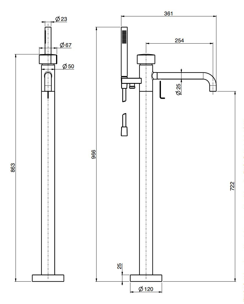 Модель представляет собой внешнюю часть встраиваемой напольной системы и оснащена переключателем, ручным душем и гибким шлангом Chromalux длиной 1500 мм. Такое решение позволяет удобно переключаться между сценариями использования и обеспечивает комфорт при проведении водных процедур, при этом все функциональные элементы интегрированы лаконично и ненавязчиво.