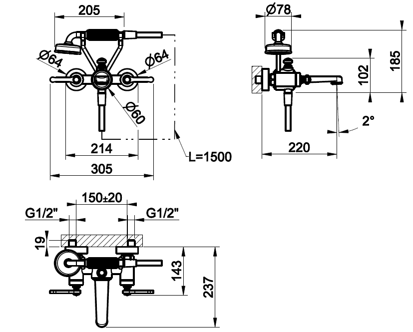 Модель выполнена для настенного монтажа, рассчитана на подключение к двум позициям и оснащена переключателем «ванна-душ». В конструкции предусмотрен подвод воды и держатель для ручной лейки, а смеситель Gessi Venti20 совместим с соответствующими скрытыми частями системы, что обеспечивает аккуратный внешний вид.