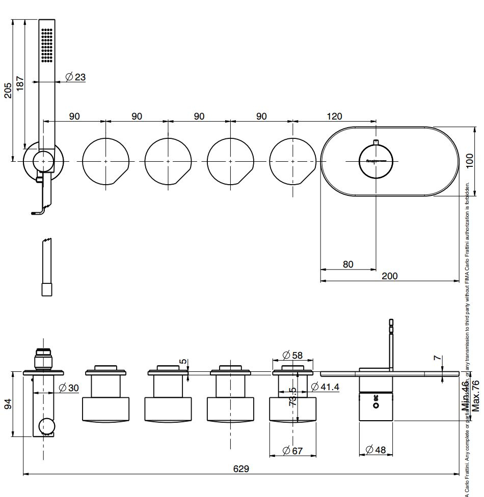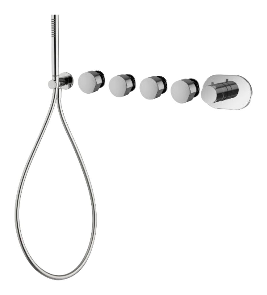 Термостат для душа и ванны Carlo Frattini SO в брашированном чёрном хроме подойдёт для интерьеров, где важны технологичность, визуальная строгость и максимальная гибкость сценариев воды. Конструкция рассчитана на подключение четырёх потребителей, что позволяет объединить верхний душ, ручной душ, излив и дополнительные выходы в одной системе. Во внешнюю часть входят ручной душ и гибкий шланг хромалюкс длиной 1500 мм, формируя готовый комплект для современной ванной зоны. Модель поставляется без ручек, что даёт свободу выбора элементов управления в рамках серии SO.