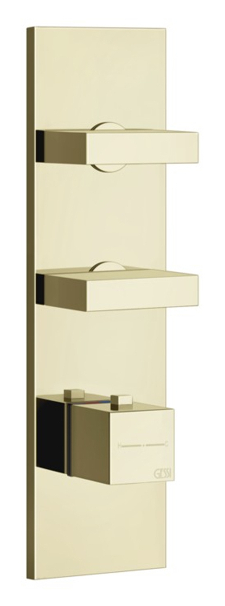Термостат Gessi в цвете Brass PVD отличается минималистичным дизайном с двумя массивными круглыми ручками, размещёнными в вертикальной или горизонтальной ориентации в зависимости от предпочтений. Тёплый оттенок латунного покрытия подчёркивает утончённый облик модели, придавая пространству выразительный акцент.