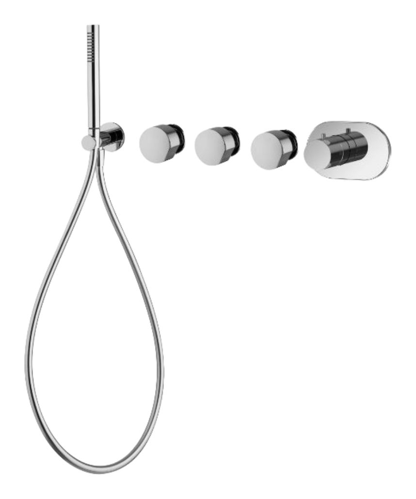 Термостат для ванны и душа Carlo Frattini SO в белом матовом цвете подойдёт для интерьеров, где ценят чистоту формы и ощущение визуальной лёгкости. Конструкция рассчитана на подключение трёх потребителей, что позволяет гибко выстроить сценарии использования с верхним душем, ручным душем и дополнительным водяным выходом. Во внешнюю часть входят ручной душ и гибкий шланг хромалюкс длиной 1500 мм, благодаря чему комплект выглядит завершённым и готовым к интеграции в проект. Исполнение без ручек подчёркивает архитектурный характер серии и даёт свободу в выборе элементов управления.
