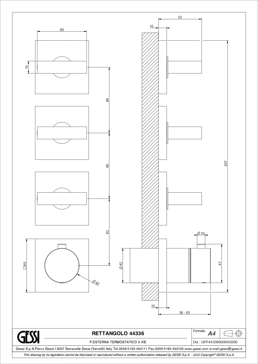 Данный термостат-Gessi Rettangolo оснащён тремя независимыми выходами, что позволяет пользователям легко контролировать и настраивать расход воды для разных зон душа или ванны. Это значительно улучшает удобство и функциональность, обеспечивая возможность одновременно использовать несколько источников воды без потери давления или температуры. Такой подход направлен на создание комфортного и индивидуального опыта.