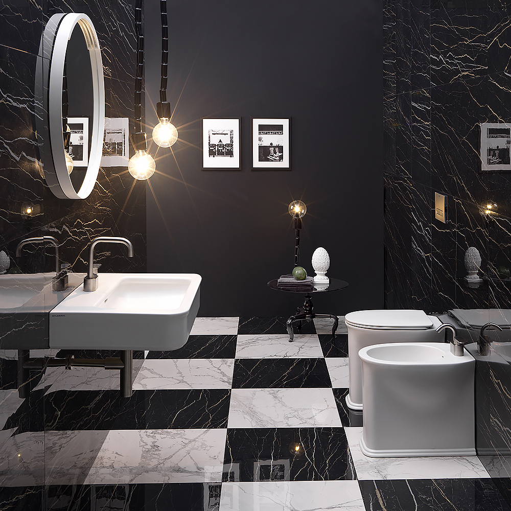Керамика с белым глянцевым покрытием подчёркивает свежесть и аккуратность, легко сочетается с любыми материалами - камнем, деревом или металлом, создавая ощущение чистоты и завершённости в санузле.
