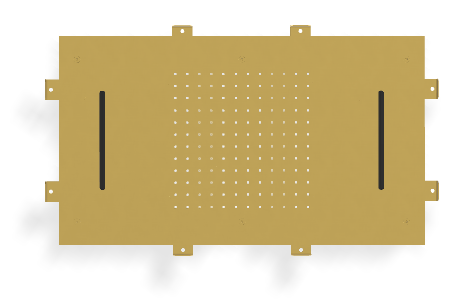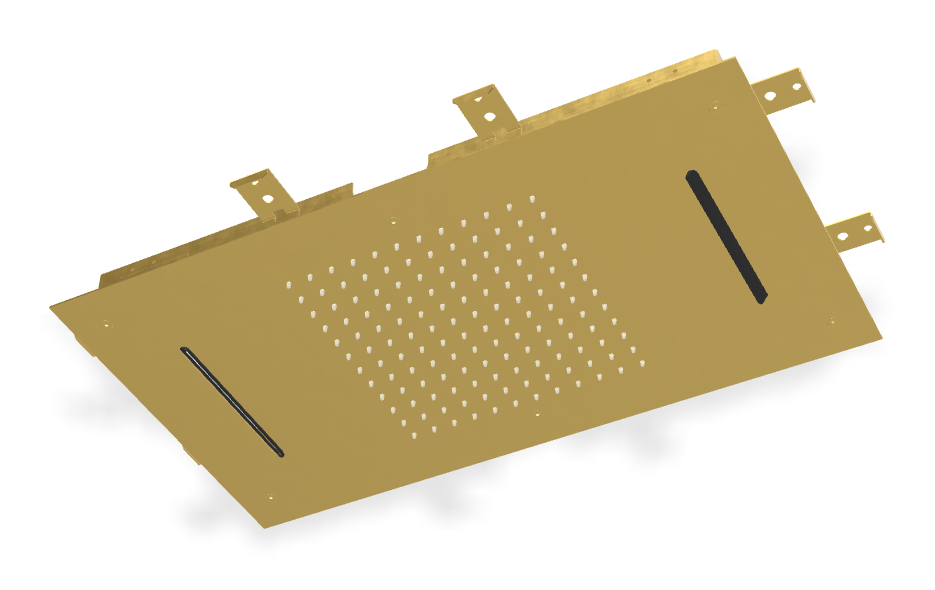 Верхний душ Carlo Frattini Harmonia в отделке брашированное золото — потолочная модель с крупным форматом 700x400 мм, рассчитанная на равномерное покрытие большой площади. Основной режим ливневого распыления создаёт плотную и естественную водную завесу, напоминающую тёплый тропический дождь: поток мягко распределяется по всему телу, расслабляет и помогает снять мышечное напряжение.