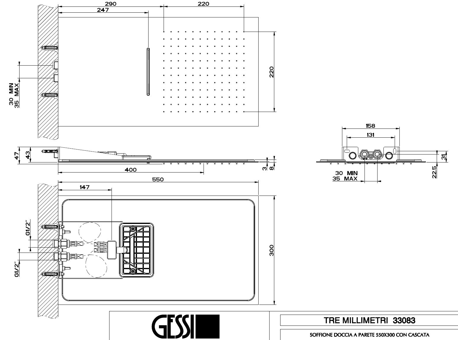 Верхний душ Gessi Tremillimetri Quadro 300 длиной 550 мм сочетает два режима подачи воды — тропический ливень и водопад. Благодаря настенному креплению и продуманной форме он обеспечивает равномерное распределение потока, создавая комфортные условия для расслабляющего душа.