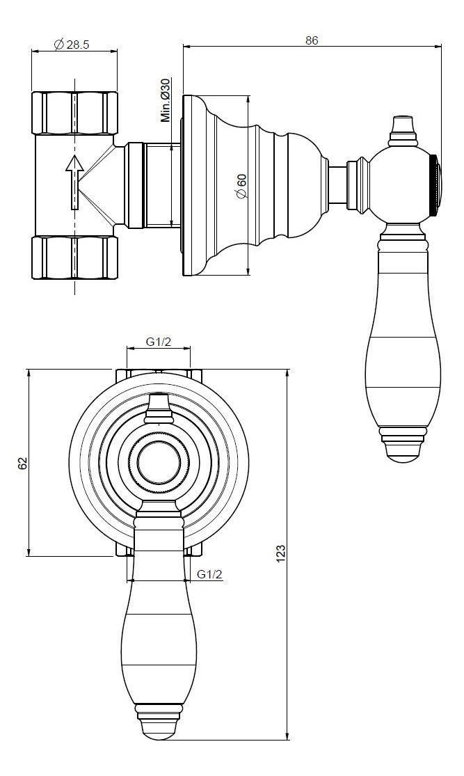 Золотая поверхность создаёт тёплый благородный блеск и хорошо сочетается с мрамором, светлой керамикой, традиционной плиткой и латунными элементами интерьера. Белая керамическая ручка смотрится контрастно и подчёркивает винтажный характер серии, сохраняя при этом аккуратность и визуальный баланс. Форма вентиля выглядит изящно и не перегружает пространство, оставаясь заметной деталью оформления.